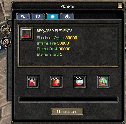 And finally after countless days/weeks/centuries of farming with sweat, the final step is to open Alchemy window > Manufacture, place these items like this;